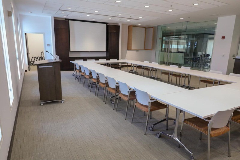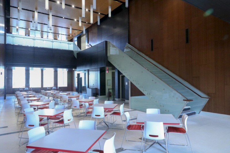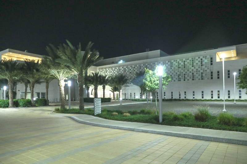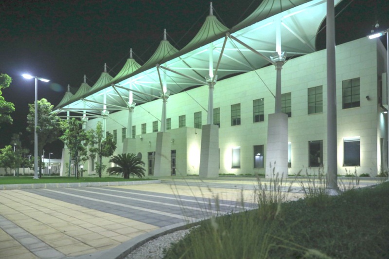 The complex maximizes its open space both on the site and within the buildings giving visitors and employees a feeling of comfort within a secure compound. The NOB is clad with stone and aluminium. To maximize solar control, the office building is oriented on an east/west axis with sunshades and a tensile structure (befitting the vernacular of the region) along the façade protecting the windows in the morning and afternoon. Interior finishes in public spaces employ the exterior palette for continuity and impact. A grand staircase connects a two-level gallery in the central core. Materials featured throughout this space include marble flooring, wood panelling, and glass handrails. Other buildings on the Site similarly use the stone finishes of the NOB and others use a cementitious coating relating to traditional stucco finishes. The New Office Building incorporates the latest in technical, physical and environmental security including building automation, life safety and emergency power generation per the requirements of the Department of State (DoS).